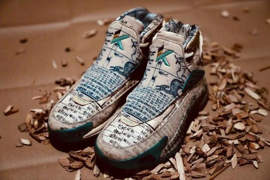 球鞋在水晶大底上标有妙手回春的字样,表明了这双球鞋的身份。《本草纲目》里的图画以及文字内容选取合理的位置进行拼接搭配,展现出浓厚文化气息的同时,又不会显得过分杂乱。