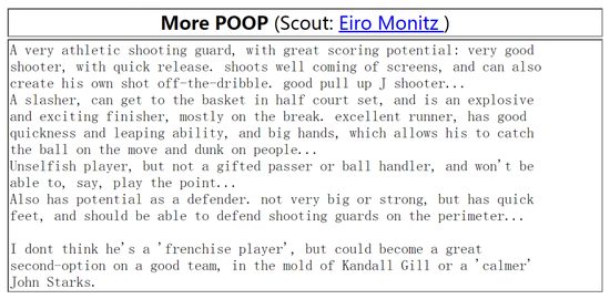在另外一份报告上,对雷阿伦的描述则更加详细:一个非常有运动能力的得分后卫,很有得分潜力;非常优秀的射手,出手速度很快;挡拆之后的投篮很好,并且可以自己持球创造投篮机会;干拔投篮不错;关键时刻毫不手软;可以从半场启动突破到篮下,非常有爆发力,终结很强,特别是在快攻的时候。