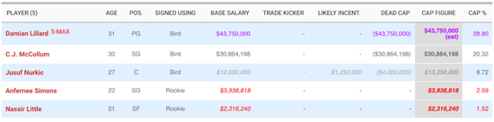 如果以当前的工资帽情况预测,开拓者21-22赛季(也就是利拉德超级顶薪合同开始生效的第二年)工资高达9400万,但这9400万只够付5个人的工资——利拉德、CJ、努尔基奇、西蒙斯、利特尔。哪还有招募高水平球员的余地呢?