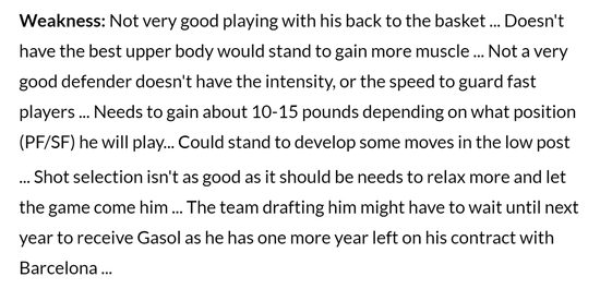 而在劣势上,对加索尔的描述则是:加索尔的背框能力并不好,他没有非常好的上肢力量,需要增加更多肌肉才行;不是一个很好的防守者,防守没有足够的侵略性,面对速度型球员也会跟不上;需要增加10到15磅,这会取决于他最终打的位置(小前锋或者大前锋)。
