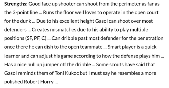 不得不说,这份选秀报告对加索尔的描述还是比较准确的,加索尔确实一个拥有出色投篮、传球甚至运球能力的大个子,他的球商非常高,而且早期的加索尔也确实偏瘦弱,甚至被批评“打球软”,不过在逐渐适应之后,加索尔最终成长为了一个巨星。
