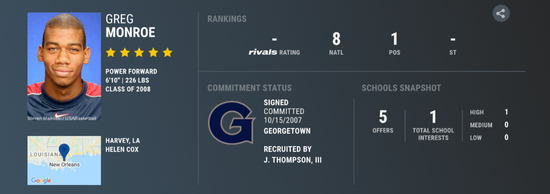作为中锋新星的门罗在乔治城、康涅狄格、杜克、LSU、德州大学五所高校中选择前者,其中深意不言自明。