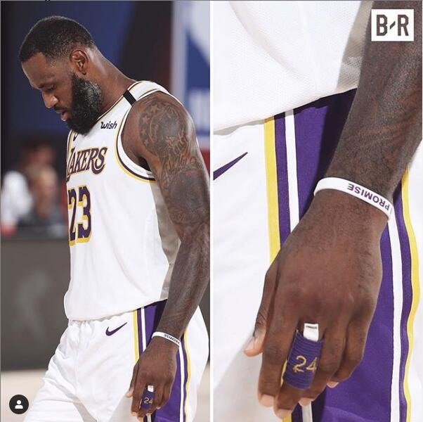 北京时间7月26日,据美媒体报道,湖人队的一场热身赛中,勒布朗-詹姆斯的左手戴着一个印着24的护指。