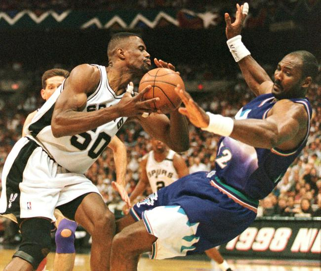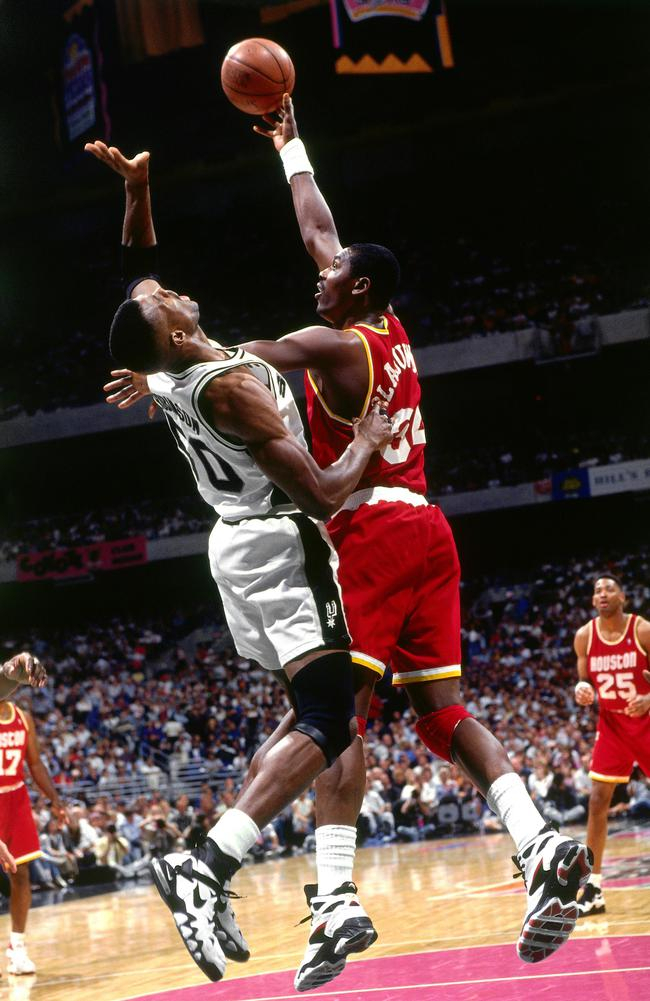1994赛季的奥拉朱旺,在常规赛场均能拿到27.3分11.9篮板3.6助攻1.6抢断3.7封盖,包揽MVP+DPOY。值得一提的是,跟乔丹1988赛季一骑绝尘不同,1994年的奥拉朱旺并没有在这两大奖项的评选中占据绝对的统治地位。而险些威胁到他的人,正是西部的另一位超级中锋——大卫-罗宾逊。