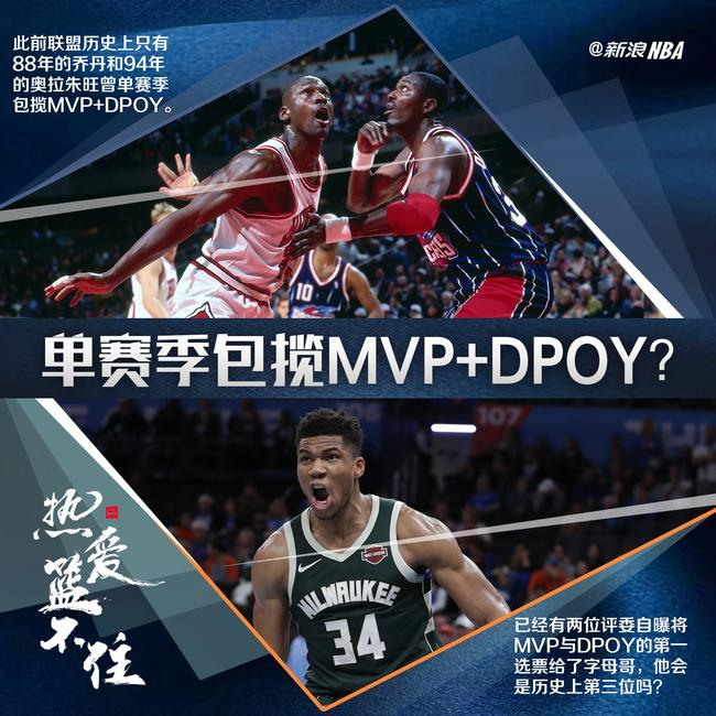 1988年的乔丹,1994年的奥拉朱旺,前者统治常规赛,后者统治季后赛,都无愧于MVP+DPOY的双名号。有了这两尊大神做参照,今年的字母哥真的强到这样的地步了吗?希腊神兽能否真的成为历史上第三位包揽MVP+DPOY的球星?让我们拭目以待……