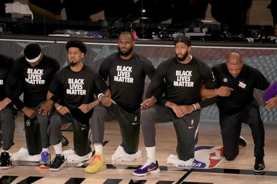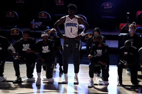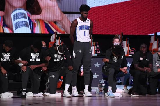 除此之外,NBA还允许球员们在比赛开始前的奏国歌环节单膝跪地——这一行为最初诞生于NFL球星科林卡佩尼克,当时卡佩尼克用这种方式抗议种族歧视,随后体育界的很多球星都效仿这一行为,已经结束的比赛里,包括詹姆斯、字母哥、伦纳德、浓眉、乔治在内的巨星都做出了这一举动。