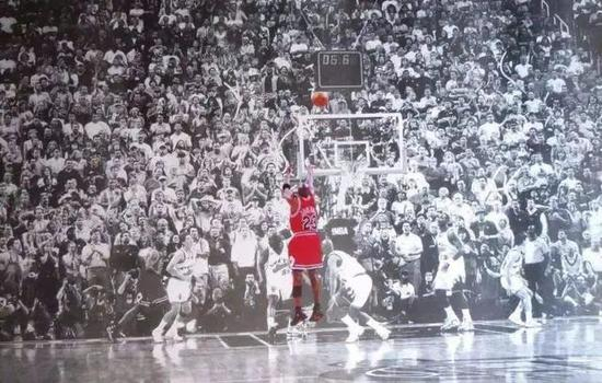 而在这场比赛中,乔丹也奉献了最经典的一瞬间:在距离第四节结束还剩17秒,乔丹抢断卡尔-马龙后运球到前场,在前场17尺处附近晃倒了拜伦-拉塞尔,将球投进,以87-86险胜爵士,夺得了生涯第六冠。