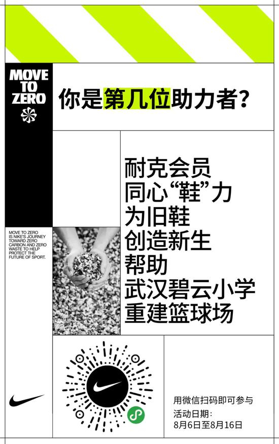 全国的消费者即日起可以通过微信小程序参与“耐克旧鞋回收计划”,同心“鞋”力帮助武汉的小学生们。同时,耐克也将通过小程序向公众及时呈现项目进展,包括旧鞋征集、旧鞋处理和加工、篮球场修建等情况,让消费者见证旧鞋“新生”的全过程。