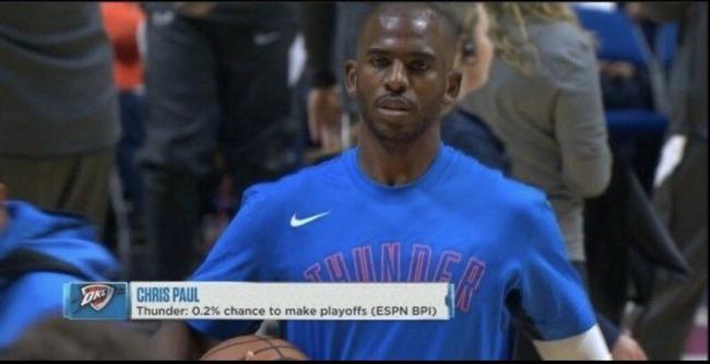 保罗在过去的几天内两次提到了ESPN在赛季初给出的“雷霆只有0.2%机会能进季后赛”的预测,这一直让他耿耿于怀。