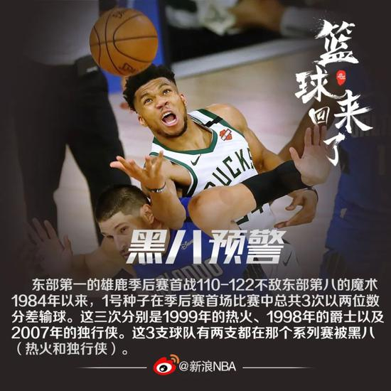 1999年的热火,1998年的爵士,2007年的独行侠都在季后赛首战以两位数分差输球,而这三支分区第一种子球队都被黑八出局。