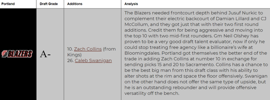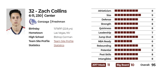 2017年,开拓者队用第15和第20两个首轮选秀权向上交易到第十号签,选择了冈萨加大学的20岁的替补内线扎克-科林斯。