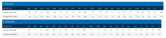 表现低迷的霍福德和哈里斯,当不与恩比德同时出场,都打出了相当高效的数据。