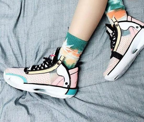 高帮版本的AJ34,延续了郭艾伦之前鞋款的中国玉配色方案,但在低帮版本上,设计灵感上发生了改变。