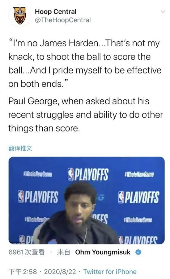 第三场16投3中后面对记者的提问乔治说:“我这段时间打得不好,不过好事是,我投篮命中率还不咋地,我们就已经取得了2-1的大比分领先。是的,我不是哈登,我打比赛的诀窍并不只是投篮和得分,我能够在攻防两端都打出高效表现,而且我对此引以为豪。但有时候我的确会有这样的比赛,我就是投不进球。”