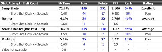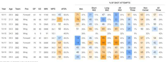 根据cleaning the glass网站提供的数据有,乔治本赛季在篮下的出手比重只有21%,低于同位置65%的球员,比他在雷霆时期低了差不多5%,他的持球进攻越来越少,他有72.6%的进攻都由跳投终结,而他在篮下的终结能力早已血崩,半场进攻中在篮筐附近终结的每回合得分,比联盟56%的球员都差。