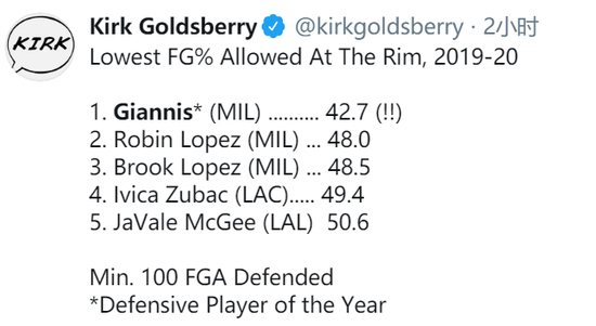 据ESPN数据分析师Kirk Goldberry的数据,全联盟至少进行过100次篮下防守的球员中,字母哥能将对方的命中率比平时下降19.8%,低至42.7%,是全联盟最好的篮下防守者。