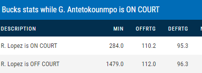 如果还有人质疑雄鹿的护框是否得益于洛佩斯也是出色的护框手,下面这组数据就足矣证明字母哥才是雄鹿真正的篮下防守核心。当雄鹿有字母哥没有洛佩斯的时候,雄鹿百回合丢96.3分;可是当雄鹿有洛佩斯没有字母哥的时候,雄鹿百回合丢103.9分。