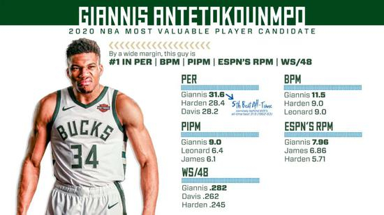 防守端的各项优秀数据,让字母哥本赛季领跑各种高阶数据,PER,PIPM,BPM,WS,RPM都是全联盟第一。