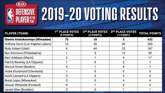 今年的最佳防守球员几乎没有任何悬念,就被字母哥以巨大的优势收入囊下。一共100张第一选票他拿到了其中的75张,以432分的总得分,遥遥领先拿到14张第一选票,总得分200分的浓眉哥。