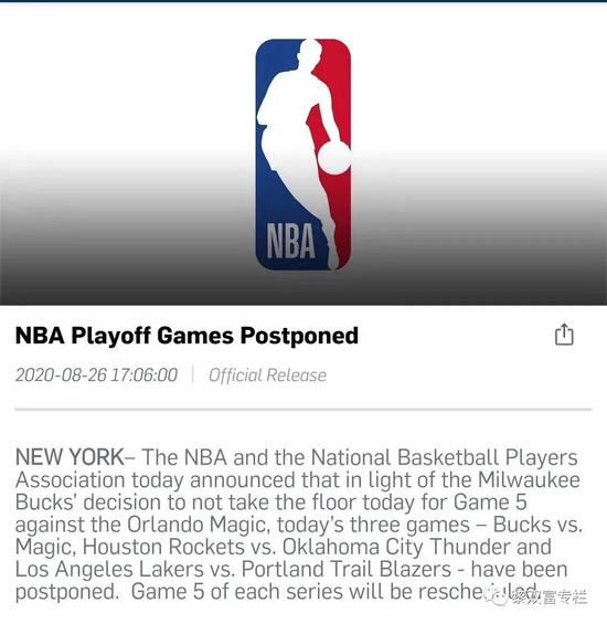 雄鹿队的罢赛,得到了湖人等其他球队的相应,NBA和球员工会也发表联合声明,宣布今天三场比赛全部推迟。不过,勒布朗·詹姆斯随后通过社交媒体表示,这次行动不是“推迟比赛”,而是“抵制比赛”。