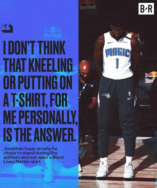 复出后的一场比赛,他就因一个举动而引起了巨大争议。8月1日魔术对阵篮网赛前,双方球员、教练都用跪地方式,表达对社会不公的抗议,唯独艾萨克站在场上,他甚至没有穿着“黑人命也是命”抗议T恤,一旁的队友表示不理解。