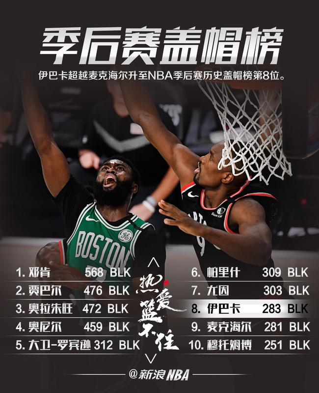 凭借本场比赛的两次封盖,伊巴卡生涯季后赛盖帽数来到283次,超越凯文-麦克海尔上升至NBA季后赛历史封盖榜第8位。