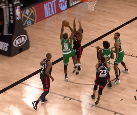 0.5秒,包括绿凯教练组在内的所有人,几乎都在想这球必须要传到内线直接空接,怎料法尔的干扰正巧成就了埋伏底角的阿奴诺比!后者接洛瑞超远距离长传后用一个近乎弹射的动作极速出手命中!!