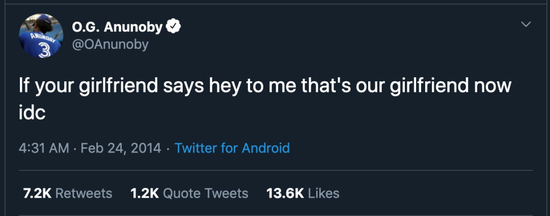 有记者挖出阿奴诺比2014年前的一条推特,他写到:“如果你的女友对我说嗨,那她就是我俩共同的女友了,对此我并不在意!”