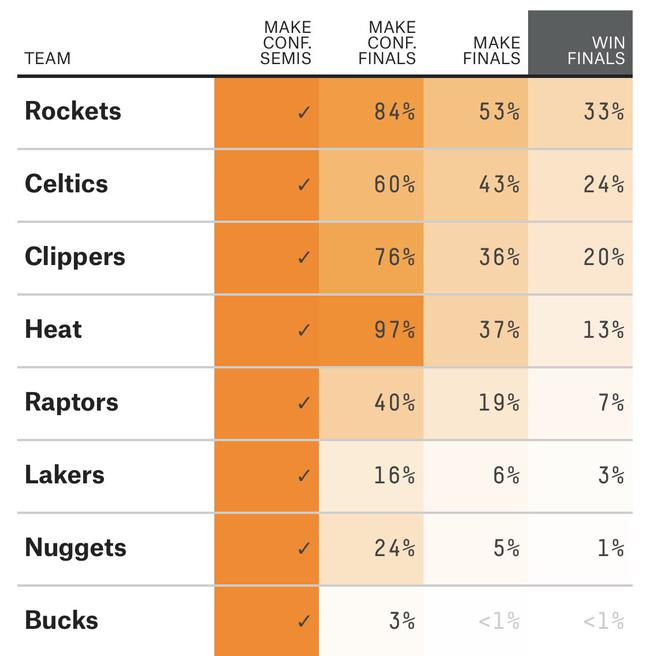 北京时间9月7日,美媒《FiveThirtyEight》计算了NBA剩余8支球队的最新的夺冠概率,火箭最被看好,夺冠概率高达33%,而湖人仅有3%的概率,排在第六,具体概率如下: