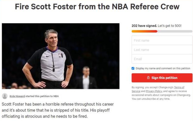 一位名叫凯里-霍华德网友在请愿网站Change.org发起投票,要求联盟解雇裁判斯科特-福斯特。本次请愿的目标是获得500人的支持,截至发稿,已有202人表示同意。