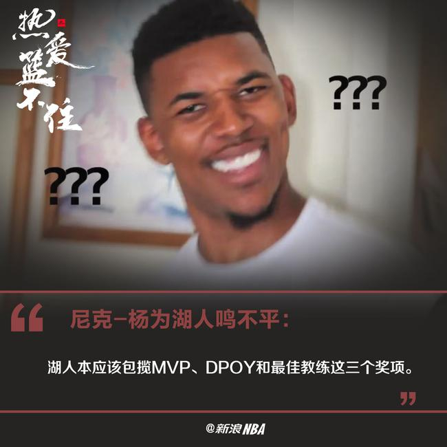 而今天,前NBA著名球员,也曾经效力于湖人的尼克-杨,就在自己的推特上炮轰了这赛季的常规赛奖项投票,他直言道:湖人这赛季本该包揽常规赛MVP,最佳防守球员和最佳教练三个奖项的。