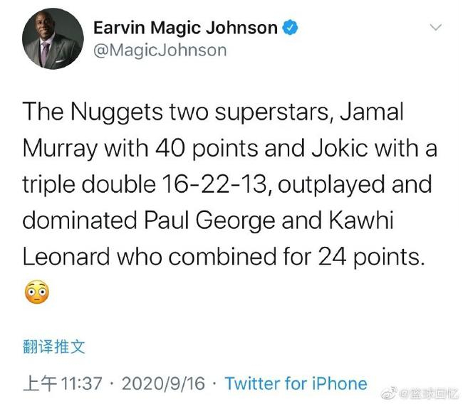 而最高调的湖人支持者,莫过于魔术师约翰逊了,他在比赛结束的第一时间就发了这样一条推特:“湖人是洛杉矶永远的主人,这永远不会改变!”
