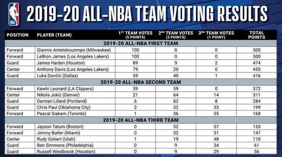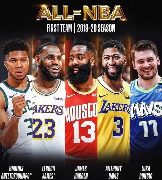 最佳一阵为:字母哥、詹姆斯、哈登、浓眉哥、东契奇。