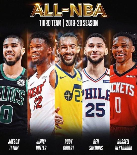 最佳三阵为:塔图姆、巴特勒、戈贝尔、西蒙斯、威少。