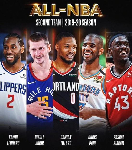 最佳二阵为:小卡、约基奇、利拉德、保罗、西亚卡姆。