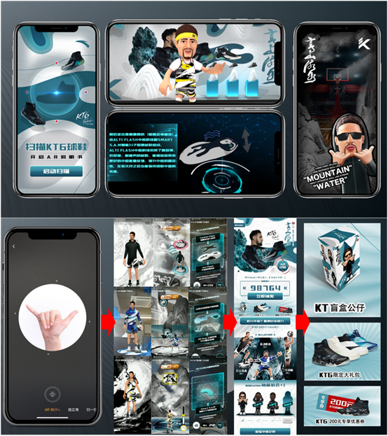 考虑到KT系列的忠实粉丝大多为年轻群体,安踏在天猫电商平台推出了一系列丰富的互动。消费者可通过参与AR游戏抽取克莱限量玩偶的盲盒,游戏本身也将KT6的设计理念和科技进行了趣味性十足的呈现。同时电商平台上还会上线一款能帮助粉丝们“一键试鞋”的AR换装互动,丰富了粉丝们的消费体验。