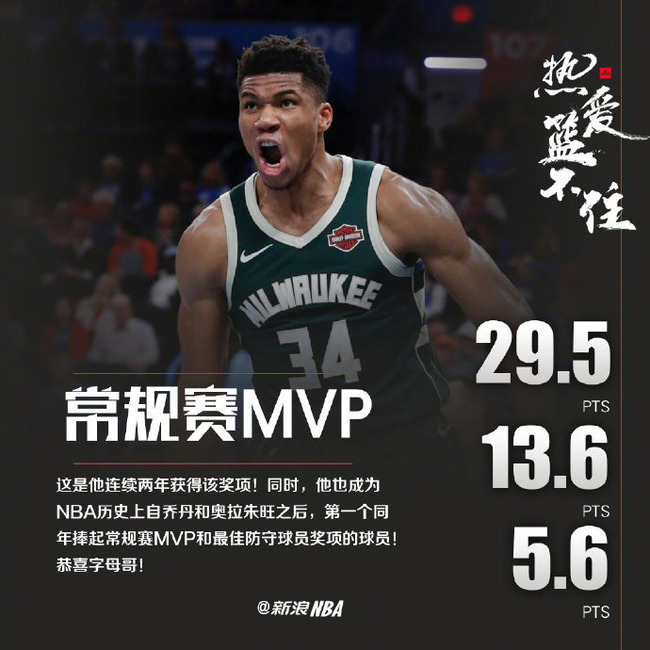 官方:字母哥力压詹姆斯蝉联常规赛MVP