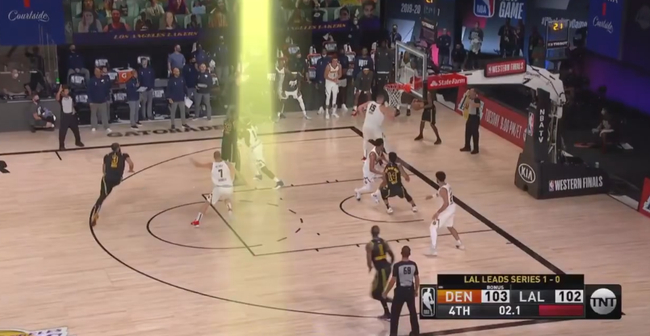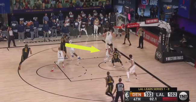 随后掘金的第一轮防守还算不错,没有给詹姆斯和戴维斯进攻的机会,卡鲁索的弧顶三分弹筐而出,丹尼-格林二次进攻直接被穆雷大帽扇出底线,只给湖人留下了两秒钟的时间。胜利女神已经不只是在朝掘金招手,基本已经投怀送抱了。