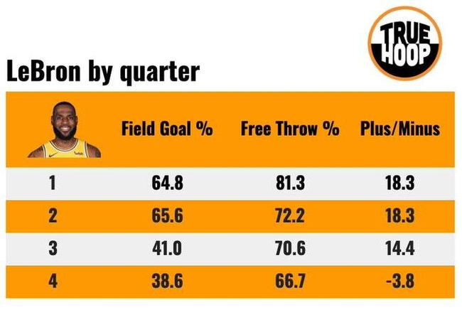 不过到了下半场,詹姆斯的效率急剧下滑,第三节命中率只有41%,到了第四节命中率下滑到38.6%,正负值仅为-3.8。