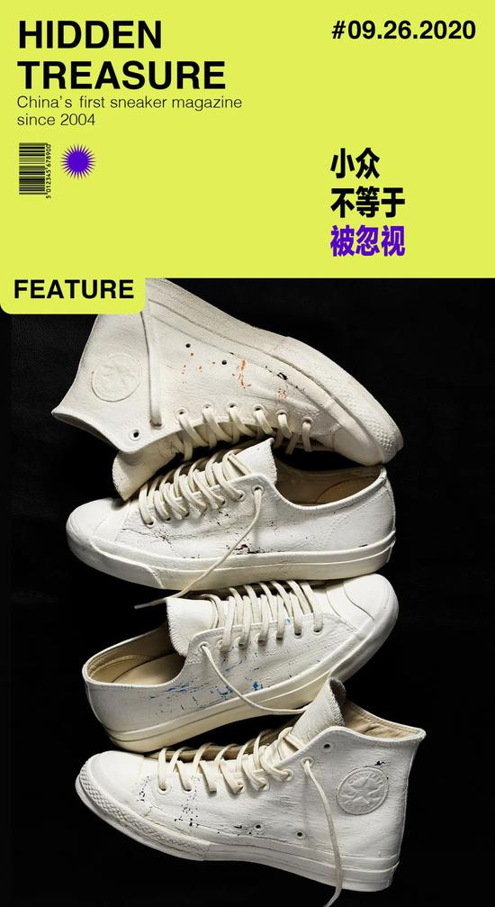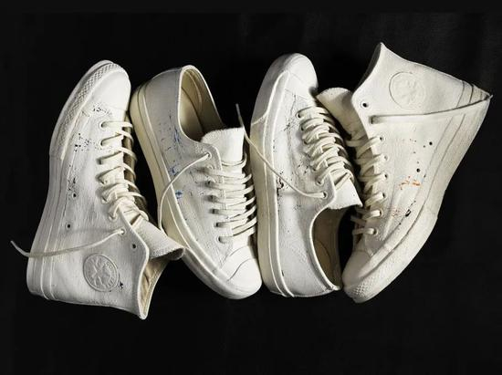 在2013年,这系列一共推出了两个鞋款,高帮的Chuck Taylor All Star和低帮的Jack Purcell。全鞋身覆盖纯白色胶质材料的底层是分别由红、黄、蓝、黑为基底的帆布面料。它的特殊之处在于,胶质面料会由于穿着的时长与走路的痕迹慢慢脱落,每双鞋都会形成独一无二的纹样。这种设计在当年的球鞋合作款的上可以说是革命性的一笔。然而让笔者没有想到的是,曾经以为该鞋款一鞋难求时,它却静静的待在货架上鲜有关注。到今天跟许多爱鞋朋友们谈起,对方也表示并不知道他的存在,形容它似乎就只是一双‘纯白的匡威’。但也许这也是Martin艺术理念的一种表象吧,爱他的人打心眼里尊敬他,然而他却把其他不了解他的人拒之门外。