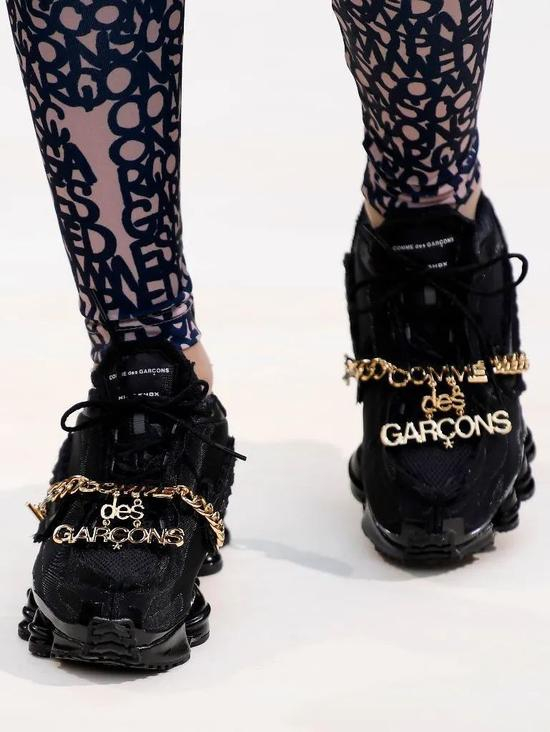 直到18年前后,经过重新调整提升的Shox才再次回到了我们的眼中,而这双COMME des GARÇONS x Nike Shox TL,笔者认为可以看做是一双具有革命意义的合作。川久保玲选择了她最擅长的解构手法,通过不同材料的叠加和碰撞,伴以当下正被推崇的日式‘侘寂Wabi-sabi’风格打造出这双独一无二的Shox鞋款。鞋身面料大多采用了不锁边的处理方式,多层面料的叠加使鞋身更加立体,最最令人惊喜的则是鞋身‘珠宝’的配合。黑色鞋款配以金色链条,白色鞋款配以银色链条,使品牌名称一目了然的同时更加凸显了品牌的设计语言和风格的碰撞。当年秀场图刚曝光的时候,笔者就认定这是一双只要发售就必须拥有的鞋款,但这双给我带来了如此视觉冲击的一双合作款在发售时却并没有引起预期的轰动,而时至今日也鲜被人提起。