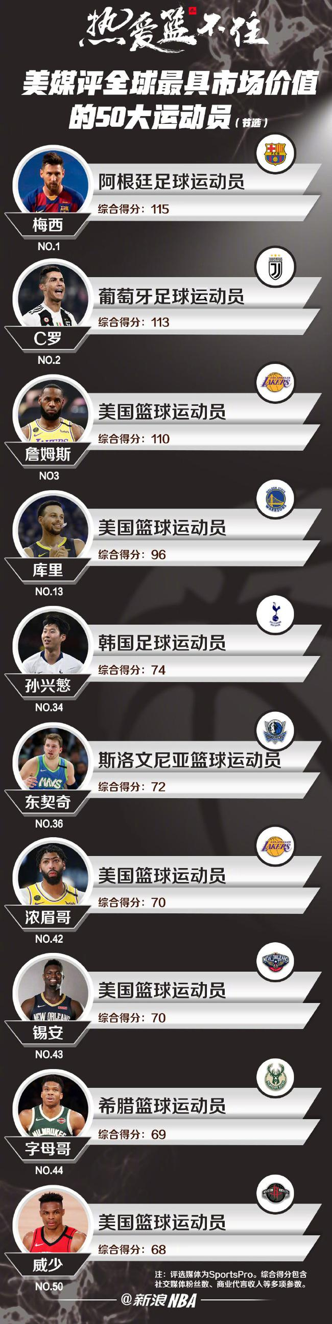 北京时间9月30日,权威机构SportsPro评选了本年度全球最具市场价值的50名运动员(Most Marketable Athletes)。其中梅西、C罗和詹姆斯分列前三。足球运动员上榜最多;共有7名NBA球员上榜。