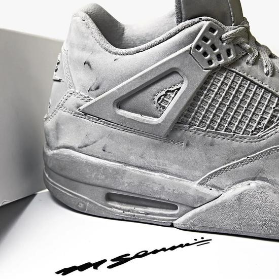 上个月就晒出一双特别的 “球鞋”,原本以为是 Air Jordan 4 的新配色,仔细看才发现是一双用水泥打造的 Air Jordan 4。