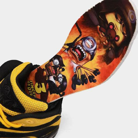 李小龙经典的黑黄战衣融为球鞋的主色调,侧向的TPU也有血痕的造型。鞋舌、后跟外侧等细节处辅以小黄人的形象,更适合年轻人的态度。