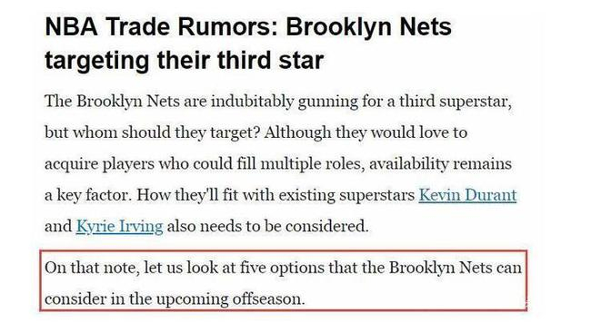 北京时间10月6日,2021年NBA夺冠赔率已经出炉,布鲁克林篮网队力压诸强高居第三,仅次于湖人和快船。而篮网如今也正在积极谋划补强,渴望为欧文和杜兰特带来第三位巨头助手。美媒为篮网列出了五位潜在目标。