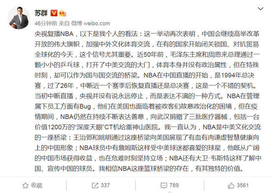 国内知名解说苏群也对央视复播NBA进行了解读,他表示:“体育本身并没有政治属性,但在关键时刻,却可以作为国与国交流的桥梁。”苏群同样提到NBA在为中国抗疫方面做出的努力,他还写道:“NBA是中美文化交流的一座桥梁。”