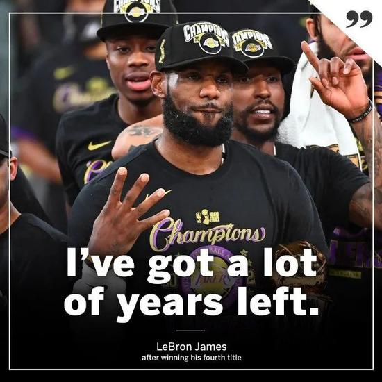 目前,詹姆斯与湖人的合同还剩下两年。至于詹姆斯生涯到底还剩下多少年,谁都没个准数,包括詹姆斯自己。在昨天夺冠后的发言中,詹姆斯袒露:“我还能再打好几年!”