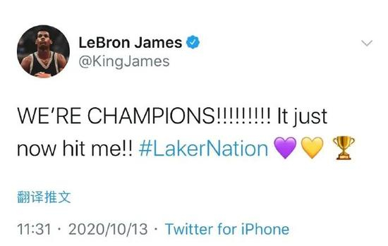 湖人总冠军,一切都那么不真实。詹姆斯刚才也发推表示:“我才猛然意识到,我们是总冠军了!”