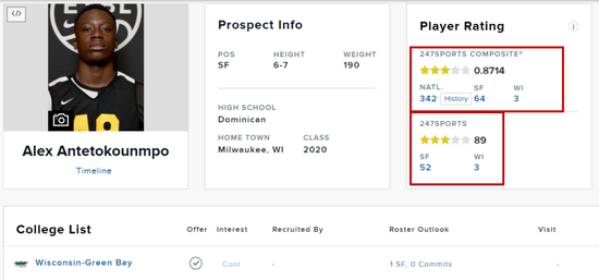 在字母哥前往雄鹿打球之后,字母弟弟也前往密尔沃基的一所高中效力,他一共两次入选州最佳第一阵容,高中最后一个赛季,他场均可以拿到20.0分7.3篮板,不过知名选秀网站247Sports对他的评价只有三星高中生,全美排名则是342位,同位置排名52位。