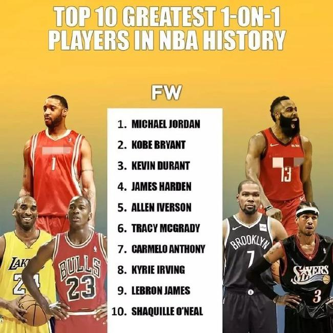 北京时间10月21日消息,美媒体近日评选出了NBA历史上1对1单挑前十名的榜单,迈克尔-乔丹和科比-布莱恩特两大超级得分手排名前两位,凯文-杜兰特列第三,而勒布朗-詹姆斯只排在第九。